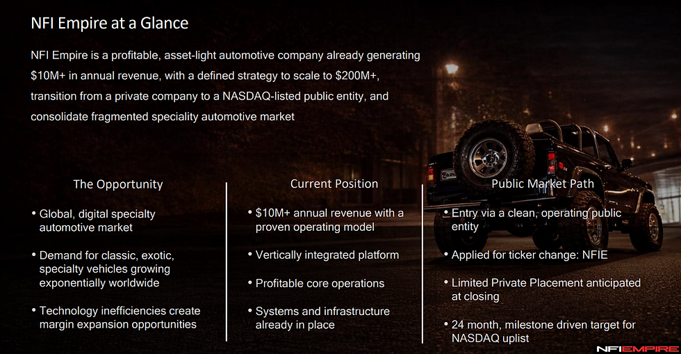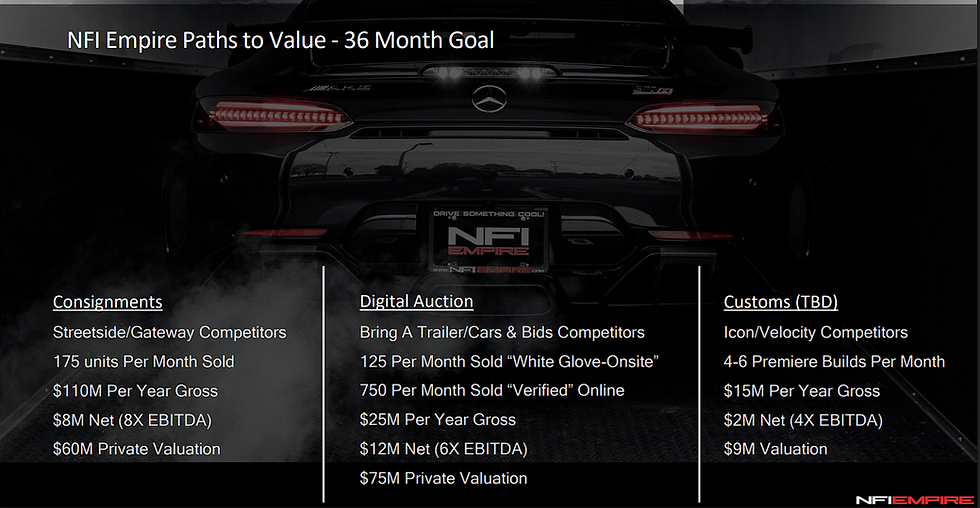 NFI’s private valuation currently exceeds $10M (based on closed private transactions). With digital scaling, a $30M–$50M near‑term valuation is achievable.